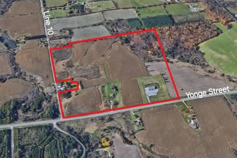 A Perfect Investment Opportunity To Purchase 100 Acres Of Farmland In An Excellent Location. Just Beside Bustling Yonge St. Connectivity To Highway 404, Highway 400, And Bradford Bypass (Future 404 And 400 Highway Connection). With A 2182 Feet Frontage Along Yonge St and 1392 Feet Frontage Along Line 10. Corner Location, High Exposure. Close To Yonge Street Widening Project. Located On The Border Of York And Simcoe, In An Area Of Major Developer Held Lands For Residential And Neighborhood Commercial Developments. This Property Features A Cozy 1,500 to 2,000 Sq. Ft. Four-Bedroom House; A 10,000 Sq. Ft. Warehouse Equipped With Office, Washroom, Heating, AC And 600 Amp Hydro Service; One Detached Garage, Two Barns And A Workhouse. The Farmland Supports A Thriving Farm Market Business And Is Leased For Cash Crop Cultivation. The Warehouse Offers Excellent Potential For Generating Rental Income, Making This A Versatile Investment Opportunity. **EXTRAS** The Property Generates Several Streams Of Income. The Income Info Can Be Provided By Signing An NDA. Vendor Take Back Mortgage Is Possible For Qualified Buyers. Please Find The Marketing Brochure In The Attachment.