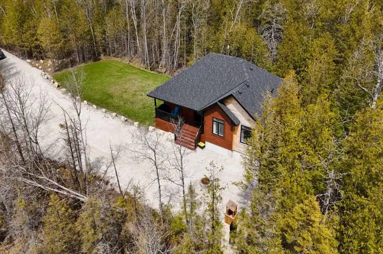 FEEL AT HOME! This 100ft. X 200ft. property offers plenty of parking as well as privacy from the surrounding trees. Located a short drive to Miller Lake and public water access for swimming, boat launching, as well as a campground with store and restaurant. Tobermory and Lions Head are both within 30km of the property for easy access to amenities, groceries, shops and more. Enjoy your morning coffee under the covered porch rain or shine. As you enter the 1,300sq.ft. home, you are greeted with a spacious foyer with large coat closet. The vaulted ceiling and treed views immediately pull you into the open concept living space. Comforts and convenience are found in the kitchen with the island, SS appliance package, quartz countertops and soft-close cabinetry. Easily enjoy family meals, games and entertaining here. Steps away are 3 bedrooms. Two bedrooms feature closets and large windows, sharing a 4-Pc bathroom. The primary suite offers a WIC as well as luxurious 3-Pc ensuite. Main floor living, separate laundry room, easy-clean flooring, central air conditioning & propane furnace. Come join this wonderful community and call Miller Lake your home, getaway or next adventure! **EXTRAS** Conveniently located just off Highway 6. Explore various hiking trails, caves, beaches, the National Park, and attractions across the Bruce Peninsula!