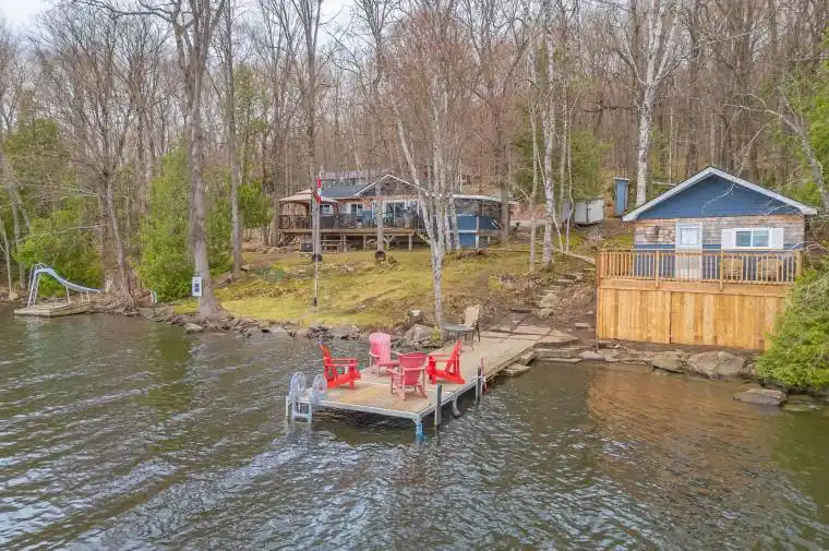 Charming 3 bed, 1 bath plus 2 additional bunkie’s. 4-season Cabin at Three Mile Lake. A picturesque retreat surrounded by birch, pine, & sugar maple. With its charming Rustic Canadian aesthetic, it’s the perfect taste of Muskoka living. Arguably one of the best spots on the lake with expansive, breath taking lake views, deep water with sandy bottom off the fixed dock (wave and wake-proof). Watch sunsets from the dock, then gather by the lake for a cozy fire and roast marshmallows under the stars. Property features a Muskoka room, 2 cozy bunkie’s, with one on the water, property sleeps 14 people. Wood shed and two additional storage sheds, ample parking, back up generator, brand new roof. Close proximity to Port Carling and Bracebridge.The property has been thoughtfully upgraded with several recent improvements that significantly enhance its comfort and functionality. A new waterside bunkie deck was installed. A Brand new shingled roof on the cottage, ensuring durability and aesthetic appeal. In 2022, the water system was fully upgraded with a new water tank and UV water filtration system, including a tannin filter, which provides clean and clear water. Additionally, features like a heated water line, propane furnace, and a heat pump were added to improve energy efficiency and comfort throughout the year. The property also includes a Briggs & Stratton generator, providing reliable backup power, and comprehensive insulation under the house and in all interior walls, which helps maintain consistent temperatures. The interior was completely renovated, updating the kitchen, living room, bedrooms, ceilings, and floors to modern standards, creating a fresh and inviting atmosphere. These updates collectively make this lakeside retreat highly desirable, combining recent modernization with natural beauty.