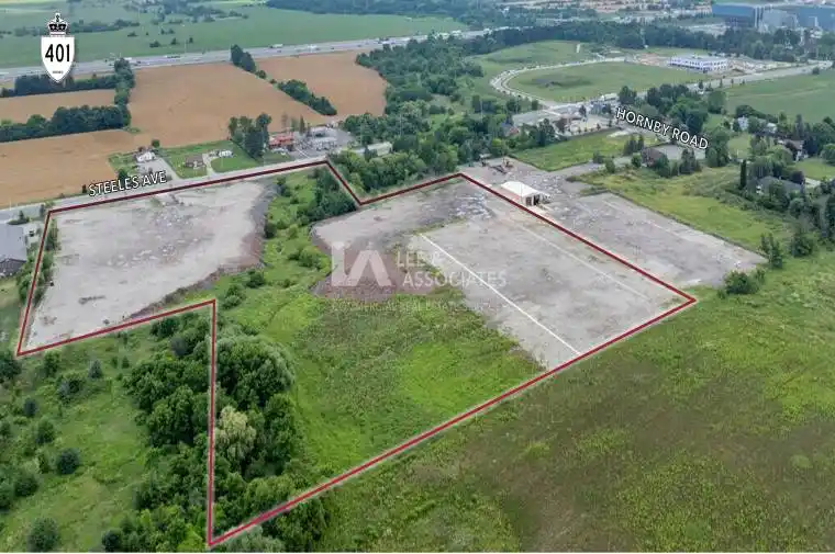 Exceptional opportunity to acquire 14.44 acres of industrial development land within Halton Hills Premier Gateway Employment Area. Located on the north side of Steeles Avenue just west of Hornby Road, the site offers approximately 8.66 acres of net developable land, with the balance regulated by Conservation Halton. Designated for Prestige Employment Industrial uses under the Towns Secondary Plan, this parcel is ideally suited for logistics, warehousing, and industrial users seeking scale in a growth corridor. Full municipal servicing (water, sanitary, storm} is available along Steeles Avenue. Surrounded by leading industrial occupiers and new development, this is a rare opportunity to secure a large, policy-supported site in one of the GTA West’s most strategic employment nodes.