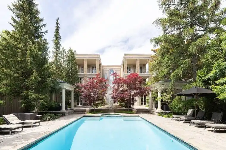 Majestically situated on one of Forest Hills most prestigious streets, this captivating residence masterfully designed by world-renowned architect Gordon Ridgely exemplifies timeless elegance and impeccable craftsmanship. Rooted in classical principles of symmetry, proportion, and balance, the home offers a remarkable blend of grandeur and comfort, ideal for both lavish entertaining and refined everyday living. A wealth of floor-to-ceiling windows, French doors, Juliette balconies, and multiple terraces bathe the interior in natural light, creating an airy, seamless flow throughout the living spaces. Exquisite finishes abound, including wide-plank mahogany hardwood floors and Indiana limestone flooring. The mahogany-paneled library, complete with a wood-burning marble fireplace, offers a warm and sophisticated retreat. A dramatic double staircase leads to the second level, where the serene primary suite features its own fireplace, a spacious walk-in dressing room, and walkout to a private covered terrace. The lower level is a haven for relaxation and recreation, boasting a full spa, entertainment and exercise rooms, and walkouts to beautifully landscaped gardens. Outdoor highlights include a charming gazebo, built-in BBQ, elegant fountain, and a stunning pool all shaded beneath a canopy of mature trees, providing an idyllic and private setting. An incomparable sense of privacy radiates timeless grace and charm, offering a sanctuary in the heart of the city. Perfectly positioned in an enviable location, this distinguished address places you within walking distance of Toronto’s finest private and public schools, the boutiques and cafés of Forest Hill Village, premier recreational facilities, and just minutes from downtown and the financial district.