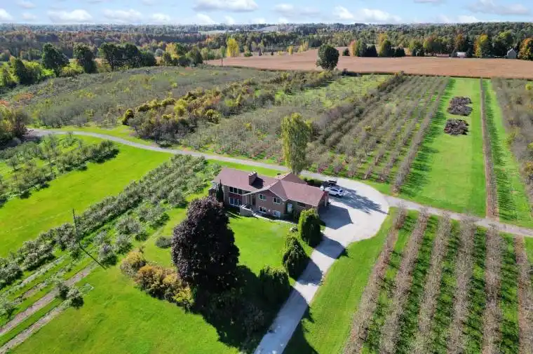Apple orchard & Cidery located at the high-visibility corner of Milburough Line and Carlisle Road. This is a rare commercial agricultural property in the heart of Carlisle an increasingly popular rural destination for tourism, cycling, and local food ventures. Just a short drive from Toronto and U.S. border, the area attracts consistent traffic and growing demand for agri-tourism, on-farm retail, and value-added ventures.This 37.68-acre site combines rural charm with high-functioning commercial infrastructure. The1,550 sq ft cidery and retail space is licensed for tastings, sales, and events, and features two 14×12 ft drive-in doors, removable French doors for loading or event configuration, 15 ft ceilings, industrial-grade flooring, and 3 washrooms. Open lawn space provides opportunity for outdoor events, seasonal markets, or functions, with ample paved parking on site. The 6,070 sq ft food-grade facility is attached and includes cold storage, radiant propane heating hookups, high ceilings (up to 17 ft), a distillery with tank and exhaust infrastructure, a supervisors office, staff washroom, and secure loading logistics with interior and exterior grade-level doors. The 640 sq ft commercial area also suits use as a secondary suite or office. Also included is a 2,000 sq ft drive shed with 13 ft ceilings and a 12 x 12 ft overhead door, a1,330 sq ft lean-to for pallet storage, and a premium garage workshop with 6-zone in-floor heating, hoist, insulated storage bay, and central vac ideal for agricultural, mechanical, or distribution purposes. Zoned agricultural with a wide range of permitted uses, the property includes two septic systems, two drilled wells, Bell Fibre internet, transferable liquor licenses, and an established wholesale network. The detached raised bungalow 3+2 bdrms and 3 baths residence also offers living, staff housing, or rental income, making this a multi-purpose investment with immediate commercial and residential functionality.
