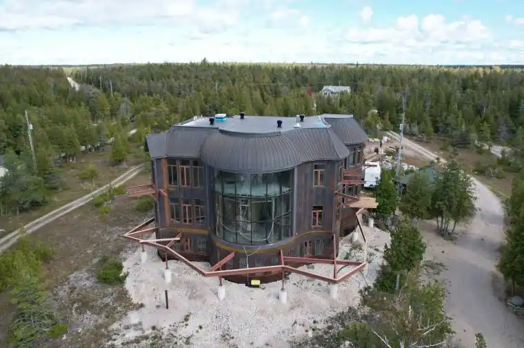 THIS IS NOT A FINISHED HOME! It is a once-in-a-generation opportunity to complete one of the most architecturally ambitious waterfront residences on the Northern Bruce Peninsula. Set on over an acre with approximately 350 feet of direct Lake Huron frontage, this striking Corten steel residence spans nearly 6,000 square feet of bold, future-forward design. Framed in weathering steel with brass and copper accents, the structure has been engineered for longevity, resilience, and dramatic visual impact in one of Ontario’s most rugged and beautiful coastal settings.The home is (un) intentionally unfinished, offering the next owner complete creative control over interior finishes, layout refinements, and final execution. Floor-to-ceiling curved glass captures sweeping, uninterrupted views of Lake Huron, while expansive cantilevered (framed) decks and multiple levels of living space create endless potential for a world-class private retreat, architectural showpiece, or high-end luxury rental. Located minutes from Tobermory and Fathom Five National Marine Park, the property includes direct water access via a private path to the shoreline, ideal for kayaking, paddleboarding, and exploring the iconic limestone coast. Offered under a non-traditional type of sale and sold as-is, this is a rare chance to acquire an irreplaceable waterfront structure with extraordinary bones, scale, and setting – a true legacy project for the buyer who values vision over convention.