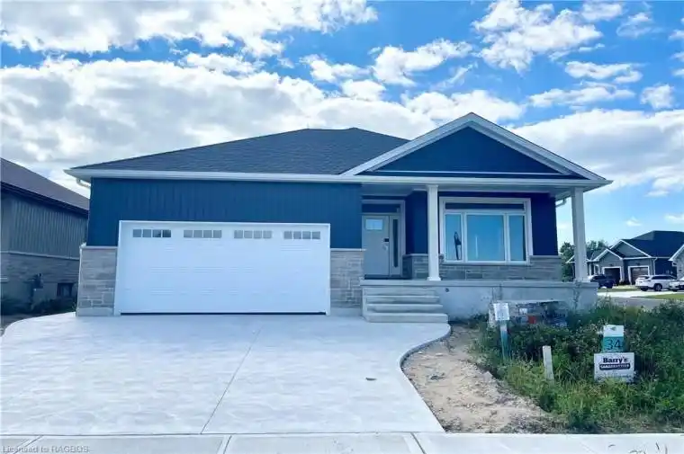This 1453 Sqft bungalow is located in a Golf Course Community; at 159 Westlinks Drive in Port Elgin. The main floor features an open concept great room, dining area and kitchen with gas fireplace, 9ft ceilings, hardwood floors, Quartz kitchen counters and walkout to a covered rear deck 9’6 x 14. The balance of the main floor features a primary bedroom with walk-in closet and 3pc bath, den, laundry room and powder room. The basement will be almost entirely finished featuring a family room, 2 bedrooms, and full bath. There is a monthly Sports Membership Fee of $135 that must be paid providing access to golf, pickleball / tennis court and fitness room. HST is included in the purchase price provided the Buyer qualifies for the rebate and assigns it to the Builder in closing. Prices subject to change without notice