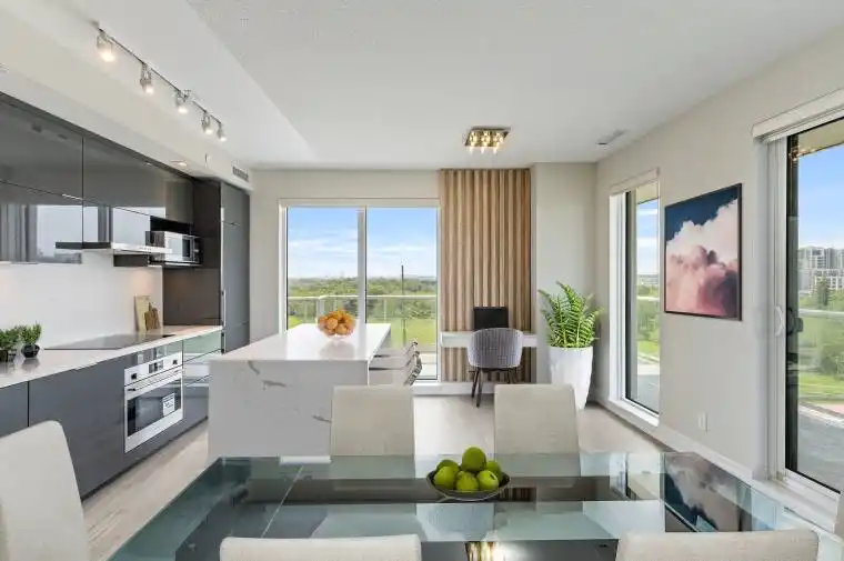 Welcome to this luxurious corner-unit condo in the heart of Downtown Markham, offering the perfect blend of style, function, and location. With 969 sq. ft. of interior space, this unit is flooded with natural sunlight through expansive floor-to-ceiling windows. The modern open-concept layout features a fully upgraded interior ideal for families, professionals, or anyone seeking a sophisticated lifestyle. The unit boasts a thoughtfully redesigned kitchen with a stunning quartz waterfall island, built-in appliances, and integrated custom storage throughoutincluding a floor-to-ceiling pantry, built-in bench seating, and a dedicated computer area. Every detail was carefully considered, from accent walls to upgraded light fixtures and pot lights that add warmth and personality to every space. This 2-bedroom + den layout provides maximum flexibility, with the den easily convertible into a third bedroom. Enjoy sweeping, unobstructed views of Markham, with sunrises and sunsets best appreciated from the massive 200 sq. ft. wrap-around balcony. The building offers 24-hour concierge service and access to premium amenities, all just steps from public transit. You’re minutes from vibrant restaurants, boutique retail, Cineplex, YMCA, York University Markham Campus, the GO Train, and quick access to Hwy 407 ETR. This is a smoke-free, meticulously maintained unit with significant investment in custom upgrades.