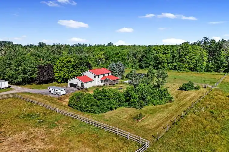 Set on 37 acres of picturesque countryside, this hobby farm offers the perfect blend of peaceful rural living and practical functionality. A charming barn, fenced paddocks, and approximately 20 acres of workable hay fields make this an ideal property for equestrian or farming pursuits. Begin your mornings on the tranquil front porch, soaking in views and the quiet rhythm of country life. Step inside to a spacious front entry that leads into a bright front living room with French doors and a bay window. The open-concept main living area features a cozy family room with a fireplace and walkout, a dining space framed by a sunny bayed window nook, and a well-appointed kitchen with stainless steel appliances, pantry, breakfast bar, and generous counter and cabinet space. The main floor also features a versatile office or bedroom with a large window, a guest bathroom, laundry area, and a convenient mudroom. Upstairs, the spacious primary suite boasts a full ensuite with a soaker tub and separate shower. Three additional bedrooms and a full bathroom complete the upper level.Step outside to enjoy the covered back deck, a fenced yard area, and attached garage. Outbuildings include a barn, paddocks, and additional structures to support your agricultural needs. The property features approximately 4 acres of fenced paddocks, equipped with electric fencing and an automatic water feeder in two of them. Whether you’re seeking a hobby farm or a serene country retreat, this property is the ideal escape.