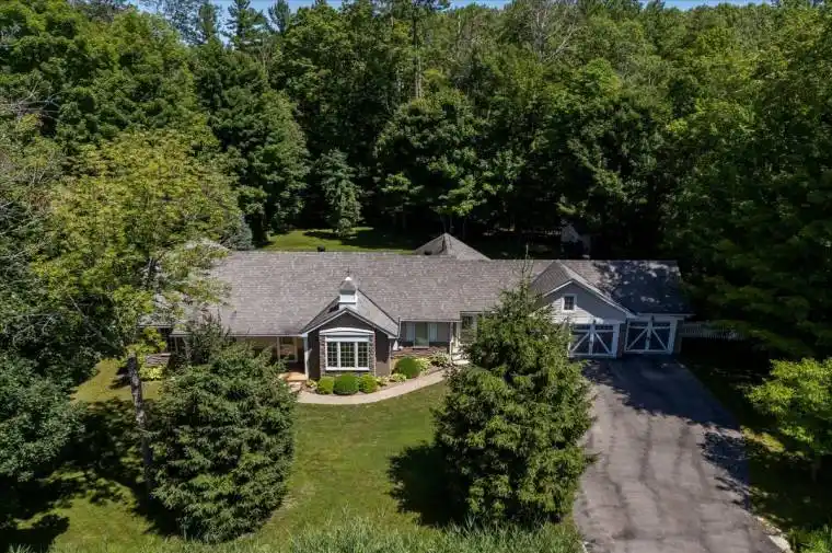 Welcome to 220 Gilwood Park Dr in beautiful Penetanguishene, a meticulously maintained bungalow nestled in one of the areas most sought-after estate communities. Surrounded by mature trees on a private, 0.6-acre lot, this home offers the peace, space, and privacy you’ve been looking for. With over 3,300 sq ft of finished living space, this residence is thoughtfully designed for easy, main-floor living. The bright and airy open-concept layout features vaulted ceilings, crown moulding, and large windows that flood the space with natural light. A stunning stone fireplace adds warmth and character to the living room, while the timeless kitchen boasts granite countertops, generous storage, and a centre island perfect for prepping meals or gathering with friends. Enjoy morning coffee or evening drinks in the spacious screened-in Muskoka room, offering serene views of the lush, fenced yard. The primary suite is a true retreat with walkout access to the deck, a spa-like ensuite with jacuzzi tub, and a walk-in dressing room with built-ins. A second bedroom with private bath provides ideal space for guests, and the laundry tucked into the ensuite makes day-to-day living effortless. Downstairs, a fully finished basement extends your space with a cozy family room, additional bedroom, workshop, and full bath. Located on a street just minutes from Georgian Bay, this exceptional home offers the perfect blend of privacy, community, and convenience. Whether you’re downsizing, retiring, or simply craving a slower pace in a stunning setting this is the one.