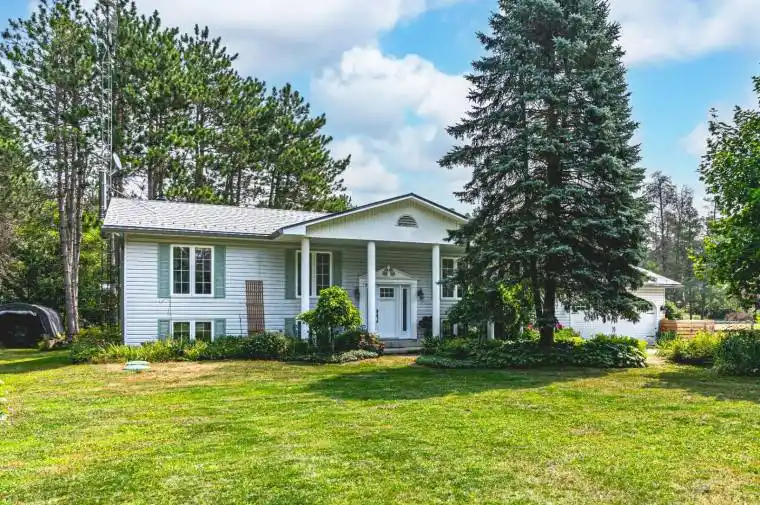 MULTI-GENERATIONAL LIVING ON 3.92 ACRES OF NATURAL BEAUTY SET ALONG THE NOTTAWASAGA RIVER! This property doesnt whisper potential, it shouts it from the treetops, across the river and over the pond. Sitting on 3.92 private acres with 152 feet of frontage on the Nottawasaga River, this raised bungalow is surrounded by towering trees, forest views, and endless natural beauty. A peaceful private pond with lily pads, a wooden footbridge, and visiting wildlife sets the scene for skating in winter, paddle boating in summer, and quiet evenings by the fire pit. The beautifully landscaped grounds also include lush perennial gardens, vegetable beds, and an outbuilding with barn-style stalls. The exterior charms with shutters, a covered front entrance framed by stately columns, a newer front door, and a steel roof. An attached 2-car garage with a newer door and inside entry pairs with a driveway that easily fits 10 or more vehicles. Inside offers over 2,500 finished square feet with two completely separate living areas, ideal for multi-generational families or in-law potential. The main level features crown moulding, hardwood flooring, and a kitchen with granite counters, tiled backsplash, newer appliances, two-toned cabinetry, and modern hardware. The kitchen opens to a sunroom with skylights, backyard views, and a walkout, making it the ideal spot for morning coffee. The primary bedroom offers a modernized 3-piece ensuite and double closet, while two additional bedrooms share the main 4-piece bathroom. The finished basement is bright and welcoming with wainscotting, a full kitchen, a family room with a fireplace, two bedrooms, a full bathroom, and a private entrance. Located close to schools, parks, dining, daily essentials, the Angus Rec Centre, Canadian Forces Base Borden, and just 20 minutes to Barrie. Let the stillness settle in, listen to the river, and youll understand why this #HomeToStay stands apart.
