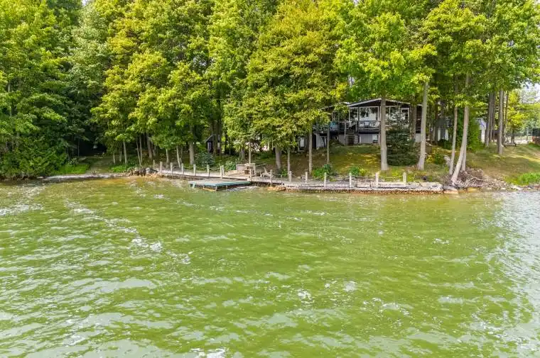 Where the shoreline stretches wide and the seasons play out at your front door, this Lake Eugenia property delivers space, privacy, and four-season fun. At least 180 feet of south-facing shoreline sets the stage for year-round living or your future build. Once an original double lot, this 0.639-acre property is mostly treed and natural, with a forest floor that blends seamlessly into the shoreline. A full-length walkway stretches across the water’s edge, set over a stone wall, leading to a dock for deeper-water access. At the west end, a sandy beach with a gentle, shallow entry is perfect for children or relaxed wading. The Viceroy-style bungalow, built in 1968 with a later-added basement, offers a total of five bedrooms and two bathrooms. The main floor features three bedrooms and a five-piece bath, along with a galley kitchen that opens to the dining and living rooms. Expansive windows frame the lake views, and multiple walkouts lead to a wraparound deck, perfect for morning coffee, summer meals, or simply soaking in the scenery. The walkout lower level includes two additional bedrooms, a three-piece bath, and a laundry area, plus a spacious rec room warmed by a propane fireplace with direct access to the outdoors. The main heat source is electric baseboard throughout, and the septic system was replaced in 2021 and a Hy-Grade metal roof in 2006. A detached, uninsulated, oversized double-car garage provides space for vehicles and gear. This property is ideal for those seeking a premium lot with an affordable cottage to enjoy as-is, or for anyone planning to build a custom waterfront retreat now or in the future. Whether your days are spent swimming, paddling, or fishing from your dock, skiing at nearby Beaver Valley Ski Club, or hiking the Bruce Trail, this location offers four seasons of recreation and the rare privacy that comes with such generous frontage on Lake Eugenia.