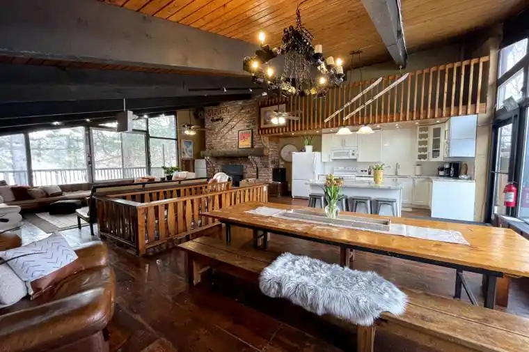 Incredible opportunity to own a premium licensed STR Tyrolean Village Ski Chalet in the Blue Mountains. Alternatively, use it as a family cottage! This property has 7 full bedrooms, most with double sized built-in bunk beds. Potential to sleep up to 26 people in beds. Located at the end of the road for enhanced privacy and enjoyment with beautiful picturesque scenery overlooking treed ravine. Same owner for over 30 years. 2nd floor open concept living, dining and kitchen with epic grand wood burning fireplace with wall of windows on each end of the room. New kitchen with quartz countertops and eat-in island. Grand picnic bench style dining, perfect for large groups. W/O to patio on each side of the room to two separate large decks. 4 main floor bedrooms with 2 upgraded full bathrooms and main floor laundry. 3 bedrooms in the basement which also features Rec room with ping pong and walk-out to the backyard. Tons of parking! Hot Tub! One of the largest lots in Tyrolean Village! Room for potential additional or garage to be built in the side yard.