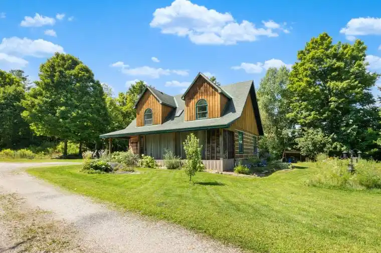 Welcome to a truly stunning log home that has undergone an impressive renovations, Seamlessly blending rustic charm with modern luxury. Set on 8.6 acres of peaceful, private land, this property offers a lifestyle of tranquility and beauty, just minutes from Perth, with easy access to Carleton Place, Ottawa, and a short drive to the Mississippi River. As you drive in, you’ll immediately feel like you’ve entered your own secluded world. Surrounded by lush gardens, outdoor seating areas, and private walking trails leading to the surrounding farm fields, this property is the perfect escape from the everyday. From a thriving food forest to a flourishing cut-flower farm, where you will find apple trees, blue berries, strawberries, vineyard , English roses, specialty peonies and English garden roses– which offers beauty and opportunity for business. Step into the screened-in front porch, ideal for enjoying your morning coffee or a quiet evening glass of wine while soaking in the sights and sounds of nature. Inside, the home will truly WOW you. Bright, airy, and finished with incredible attention to detail, every inch reflects quality and care. The chefs kitchen is a showstopper, featuring Italian marble countertops, top-of-the-line appliances, and hardware imported from England, a space where cooking becomes an experience. Upstairs, you’ll find three spacious and uniquely designed bedrooms, each full of character, charm, and warm natural textures, making them perfect for family, guests, or creative spaces. This home is magical from the moment you arrive.