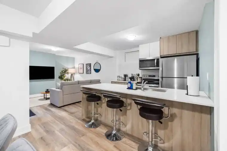 Modern 2-Bedroom 1-Bathroom basement apartment in Prime Toronto Location! Stylish and spacious suite offering approx. 908 sq. ft. of contemporary living in one of Toronto’s most desirable neighbourhoods. Features include laminate flooring throughout, open- concept main floor, sleek kitchen with stainless steel appliances, centre island, and tile backsplash. Bright living/dining area ideal for entertaining. Both bedrooms offer large windows and built-in closets. In-suite laundry & ample storage throughout. Unbeatable location steps to boutique shops, trendy cafés, restaurants, Bloor GO Station, TTC subway, and Dufferin Mall.