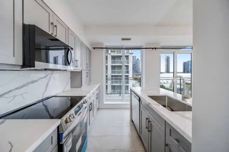 Welcome to 2119 Lakeshore Boulevard West, Unit #1003 a luxurious corner suite in the prestigious Voyager by Monarch, offering elegance, comfort, and breathtaking views in one of Toronto’s most desirable waterfront communities. This spacious 2-bedroom, 2-bathroom residence features a smartly designed open-concept layout with soaring 9-foot ceilings and expansive windows that flood the space with natural light. Step out onto one of two large private balconies, including one with serene views of Lake Ontario perfect for morning coffee or evening sunsets. The brand-new gourmet kitchen is a chefs dream, showcasing sleek granite countertops, a striking waterfall island, and premium finishes throughout. The generously sized bedrooms offer ample storage and privacy, while the modern bathrooms provide a spa-like retreat. Enjoy the convenience of all-inclusive maintenance fees covering hydro, heating, water, central air, building insurance, parking, and locker. The building’s upscale amenities rival those of a five-star resort, including a fully equipped fitness center, indoor pool, hot tub and Jacuzzi, golf simulators, theatre room, library, guest suites, and 24/7 concierge service. Ideally located just steps from transit, waterfront trails, parks, shopping, dining, and with easy access to major highways and downtown Toronto, this property offers unparalleled value and lifestyle. Don’t miss your chance to own this exceptional unit a true gem in a prime waterfront location.