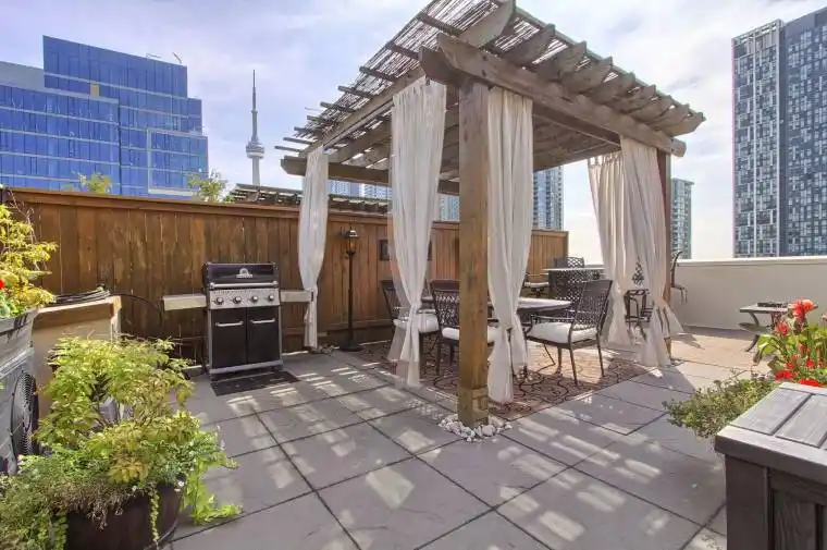 Discover the epitome of urban sophistication with our latest offering in the heart of King West Village. This stunning suite in the established Portland Park Village boasts an expansive layout spread across a total of approximately 1200 sq. ft. of living space, complemented by a 550 sq. ft. private rooftop terrace. The terrace has a gas-equipped BBQ for your outdoor culinary adventures as well a pergolas, bar & ampule seating for out door entertaining. The terrace provides breathtaking panoramic views of the city skyline, ensuring an unrivaled ambiance for entertaining & tranquil relaxation. The interior of this residence is equally impressive, featuring two well-proportioned bedrooms, with offering ample space. The open-concept kitchen & living area provide a seamless flow, with a design that accommodates full-sized furnishings without compromise. High 9′ ceilings enhance the sense of space throughout, while the suite’s southern exposure floods the home with natural light, accentuating the panoramic vistas. The kitchen is a chef’s delight with impeccable stone countertops & a full suite of stainless steel appliances, while the convenience of a pantry & a gas fireplace adds to the home’s comfort & functionality.The attention to detail continues with luxurious ceramic flooring throughout, a spacious 4-pc bathroom featuring a soaker tub & stacked washer & dryer laundry on the upper level, and a convenient 2-pc power room on the main level. Residents will also enjoy the added amenities of the building, including a well-equipped fitness centre. With its close proximity to transit options, this suite is not only a haven of luxury but also offers the ultimate in convenience for those seeking a vibrant lifestyle in downtown Toronto. This is an exceptional opportunity for down sizers seeking the perfect blend of community and city living in a respectful, homeowner-filled building. Close to shopping, Billy Bishop Airport, CNE grounds, restaurants & historic Fort York.
