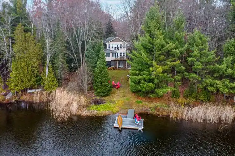 YOUR FOUR-SEASON TICKET TO LAKE LIFE WITH 140 FT OF SHORELINE ON 1.61 ACRES! Imagine mornings with coffee on your balcony as loons call across the water, afternoons spent reeling in smallmouth bass or cruising the lake by pontoon, and evenings gathered around the fire pit beneath a canopy of stars. This incredible year-round home or cottage on Crego Lake offers 140 ft of private sandy shoreline, a lush forest backdrop, and access to 600 acres of nearby wilderness trails for hiking and cross-country skiing. Set on a 1.61-acre lot along a privately maintained road, this four-season retreat is surrounded by moose, deer, and total peace, yet just 10 minutes from daily essentials in Kinmount and under 25 minutes to shopping and a hospital in Minden. Over 3,500 finished sq ft are filled with natural light, five skylights, expansive windows, two wood stoves, pot lights, and a bright open layout. The functional kitchen features dark-toned cabinetry with some glass fronts, stainless steel appliances, subway tile backsplash, and a breakfast bar ledge, while the lakeview living and dining area offers two walkouts to a balcony. A three-season sunroom with wraparound windows adds a quiet spot to soak in the views. With seven bedrooms in total, including a spacious primary suite with a walk-in closet, private balcony, and 3-piece ensuite, plus a main floor bedroom with a 4-piece ensuite and another second-floor suite with its own ensuite and walk-in closet, there’s room for everyone! The partially finished walkout basement includes a rec room with a bar area, wood stove, ample games space, and two sets of double garden doors. Two laundry areas are conveniently located on the main and second levels. A 10×16 workshop, 6×8 shed, oversized two-car garage, and parking for 8+ vehicles add functionality to the fun. Whether it’s your weekend escape or your forever #HomeToStay, this is where cannonballs, campfires, and cozy nights set the stage for a lifetime of memories made by the lake!
