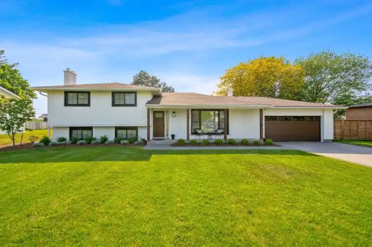Welcome to this beautifully renovated home tucked away on a quiet country setting in the heart of Niagara-on-the-Lake. From the moment you arrive, the peaceful surroundings set the tone. The oversized double driveway leads to a manicured front garden and interlock pathway that was professionally designed by Greenview Landscaping. A covered front porch invites you inside to an open concept living space filled with natural light and high-end finishes. The main floor features luxury vinyl plank flooring throughout, anchored by a stunning kitchen with floor to ceiling tiled backsplash, quartz countertops, KitchenAid appliances, built-in microwave, wine fridge and coffee bar. The dining area easily accommodates gatherings large or small while the sunroom addition is complete with shiplap accents and updated windows offering panoramic views of the private backyard and surrounding vineyards. Upstairs, the primary bedroom offers double closets and sliding patio doors to a private deck overlooking the backyard. Two additional bedrooms and a beautifully finished 5-piece bath with a double vanity complete this floor. The lower level just partially below grade, feels bright and inviting with oversized windows. Here, you’ll find a cozy rec-room with a custom gas fireplace, built-in shelving and pot lighting plus a versatile fourth bedroom and stylish 3-piece bathroom. A full additional fourth finished level (not shown in pictures) offers even more finished living space and generous storage. The backyard is a true showpiece. Exceptionally private, it features lush landscaping, interlock patio with gazebo, new hot tub (not shown in all pictures) and fire pit area with pea gravel surround, perfectly positioned to enjoy vineyard views and spectacular sunsets. Just steps to wineries and minutes to all the amenities of Old Town Niagara-on-the-Lake. A home of this caliber in such a setting is seldom available. (Home is currently running as a thriving short term rental).
