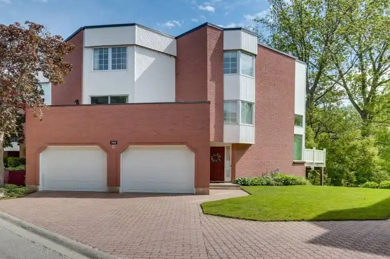 Luxurious End-Unit Condo with Spectacular Green Views and Exceptional Design. Welcome to this elegant 3+1 bedroom, 3-bathroom end-unit condo, offering a unique blend of spacious living, architectural charm, and serene surroundings. Nestled in a smaller, exclusive complex just minutes from University Hospital, Western University, Masonville Mall, and an abundance of parks, trails, and sports fields, this property delivers both convenience and tranquility. Step inside to discover a sun-drenched interior where natural light pours in from all angles, enhancing the grandeur of this one-of-a-kind home. The formal living room boasts two-storey cathedral ceilings, a dramatic floor-to-ceiling wood-burning fireplace, custom built-in cabinetry, and patio doors that open to a private deck the perfect spot to relax with views of the creek and lush greenspace. The heart of the home, a spacious eat-in kitchen, features a private terrace, ideal for morning coffee or evening meals. Adjacent to the kitchen, the formal dining room includes a south-facing bay window and a charming wrought iron Juliette balcony overlooking the living room an elegant touch that adds architectural intrigue. The upper level includes three bedrooms and/or a cozy den with custom built-ins, offering flexible space for work or relaxation. The Primary bedroom with a view of the tree line and creek below has a 4pc ensuite and walk-in closet. Downstairs, the finished walkout basement provides a bedroom or office, a laundry room with extensive cabinetry, and a cedar-lined closet and chest , an ideal mix of function and comfort. Completing this stunning home is a two-car garage and a rare sense of privacy only an end unit can provide.