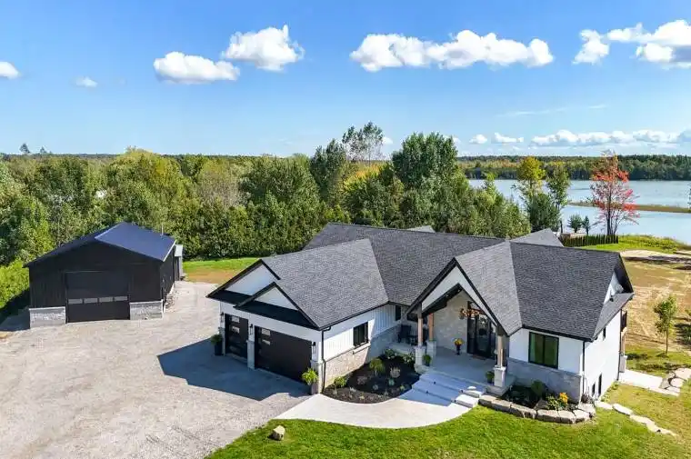 Welcome to this exceptional custom-built waterfront home (2024) set on a picturesque 1.6-acre lot with spectacular sunsets. Offering over 2,600 sq. ft. on each level, with a fully finished walk-out lower level, this home is designed for both luxury and comfort. The main floor features a chefs kitchen with custom cabinetry, a butlers pantry, and elegant finishes throughout. The luxurious master suite includes a spacious walk-in closet and a 5-piece ensuite bath, creating a private retreat. The lower level and attached garage both enjoy the comfort of in-floor heating, adding warmth and efficiency. Step outside to your own private sand area at the shoreline, gather around the firepit, or launch from the dock for a day on the water. A 3-car attached garage and 32′ x 40′ detached workshop provide abundant space for hobbies and storage. Heated and cooled with an economical geothermal system, this home offers style, efficiency, and an unbeatable waterfront lifestyle with unforgettable sunsets.