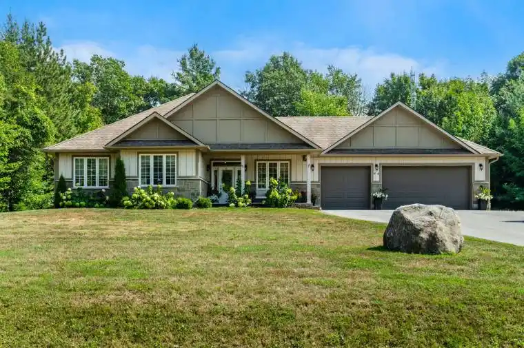 From the moment you arrive, the curb appeal is undeniable. This beautifully maintained bungalow offers a landscaped yard, stone accents, a welcoming front porch, and a spacious three-car garage. Built with full ICF construction, this home is exceptionally energy efficient and designed for lasting comfort. Situated on over an acre, the property boasts an expansive backyard oasis with multi-level decking, a hot tub, and a play area – plenty of space for outdoor living and family fun. Inside, a bright foyer opens to an airy, open-concept layout with vaulted ceilings, large windows, and a fresh neutral palette. The modern kitchen features stainless steel appliances and ample storage, while the dining area is perfect for gatherings. The primary suite includes a walk-in closet and 5-piece ensuite with a soaker tub, tiled shower, and double vanity. Two additional bedrooms and a full bath complete the main level. The fully finished basement offers a large rec room with projector setup and barn doors, a play area, dedicated home gym, two more bedrooms, and a full bath. Surrounded by mature trees for privacy, this move-in ready home is located in a quiet, family-friendly neighbourhood close to schools, amenities, and recreation.