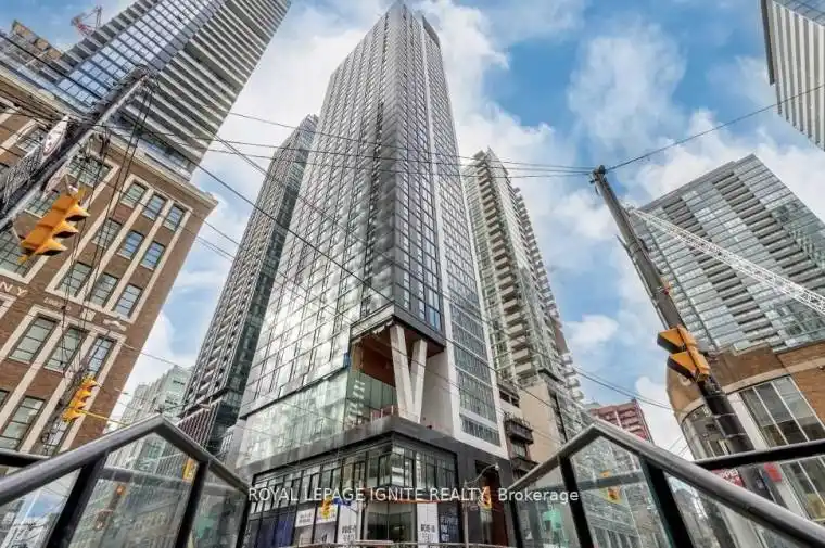 Experience luxury living in this 1-year-new 1 bedroom + den, 1 bath condo by Great Gulf, located in the heart of Torontos Entertainment District. Featuring soaring 12-ft ceilings, floor-to-ceiling windows with a clear view, and stylish laminate flooring throughout, this unit offers an open-concept layout with a modern kitchen, quartz countertops, and backsplash. The den is perfect for a home office, and the suite includes convenient in-suite laundry. Enjoy access to premium amenities including a fitness studio, yoga studio, communal workspace, and podium terrace. Steps to shopping, dining, and transit urban living at its finest.