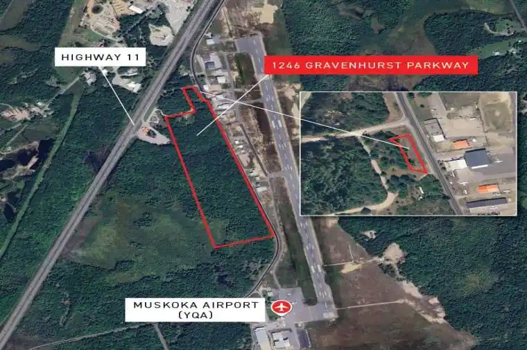 47-ACRE INDUSTRIAL LAND ADJACENT TO CANADIAN INTERNATIONAL AIRPORT. Rare, once-in-a-lifetime land parcel. Nestled beside the Muskoka Airport, surrounded by Crown land, and stewarded for decades by the same family, this 47-acre industrial parcel is more than a land-holding. It is a canvas for visionaries and a chapter waiting to be written by its next caretaker. The Property is located directly across from Muskoka Airport – an international airport and Canada Customs Port of Entry. The side of the property facing Gravenhurst Parkway is directly opposite the airports runway. Key features include: 6,000-foot runway capable of accommodating large jets such as the Globemaster; passenger and freight charter services available; situated on the 45th parallel. Direct access to Highway 11, providing a seamless route south to Toronto Canadas largest metropolitan area with a population of nearly 6.5 million just a two-hour drive from Muskoka Airport. Direct access to Petro-Canada fuel station located at the Highway 11 entry point, enhancing the sites appeal for logistics, travel, and industrial operations. The site borders other notable properties, including Transport Canada land, Town of Gravenhurst land, and Skyways Motel. Environmentally approved. The property contains a cluster of wells sufficient to support a subdivision plus two deep wells. The 280 ft deep well – natural spring water – flow rate of over 30 gpm. Purchase of the property would include sale of privately held subsurface mineral rights – this is exceptional as mineral rights are typically held by the Crown. Freehold – uncommon – industrial land this close to an international airport in North America is usually just leasehold. For a copy of our brochure with more information, please contact the listing agent.