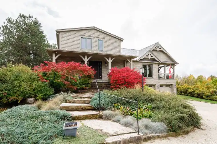 A nature lovers and gardeners paradise! 50 acres of fields and woodlot, unspoiled by pesticides for at least 48 years. The Bruce Trail, accessible at the rear of the Property, crosses the 1,000 acres bounded by the surrounding roads. In co-operation with adjacent landowners, a private trail system several kilometers long based on The Old Mail Road and old logging roads is used for hiking, horseback riding, and cross-country skiing. Your water is from an artesian spring, shared with a neighbour and with an uninterrupted flow for over a century, producing clear water free of the sulphur and iron found in wells lower in the valley. Early spring sees the emergence of watercress in the brook and wild leeks in the woods. The home is surrounded by gardens of perennials with a large vegetable garden and shed. Located on the edge of the Escarpment, a spectacular view of the Beaver Valley with breath-taking sunsets is visible from your living room and outdoor hot tub. The home was rebuilt in 2007 around a double-sided 2-storey fieldstone fireplace, the centrepiece in a cathedral ceilinged Great Room. Attached is a 2 car garage, essential for the winter months. In addition to the 5 bedrooms, for a multi-generational family, an extension has been designed to add a self-contained 1-bedroom granny flat with additional parking underneath, also with a view of the valley. For added security, a 12kw propane generator starts automatically in case of a power failure. The 12th Line has little traffic, not being a through road, however it is on the school bus route, receiving early morning snowplowing in the winter. Privacy and recreational opportunities are blended with accessibility to the nearby Ravenna Country Market, known for it for its baked goods and essentials. The present owners hope the new owners will enjoy the lifestyle of this unique property as much as they have for almost 50 years!