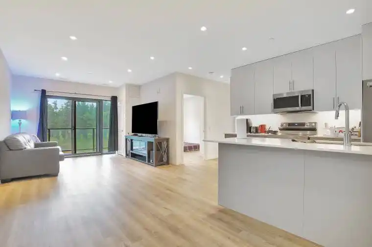 Welcome to Unit 203 at 525 New Dundee Road a stylish 2-bedroom, 2-bathroom condo offering 1,055 sq ft of thoughtfully designed living space, plus a private 100 sq ft balcony for relaxing or entertaining outdoors. Step into a bright, open-concept layout that seamlessly connects the kitchen, dining, and living areas perfect for modern living. The contemporary kitchen is equipped with stainless steel appliances, a spacious eat-in island with built-in storage, and plenty of counter space to make cooking and hosting a breeze. The primary bedroom features a private ensuite, while the second bedroom is located conveniently near the second full bathroom, ideal for guests or a home office setup. You’ll also appreciate the large in-suite storage room with laundry, adding everyday convenience and extra space. This unit includes a dedicated parking space and access to an impressive list of amenities, including year-round enjoyment of the picturesque Rainbow Lake a truly rare lifestyle offering in a prime location!
