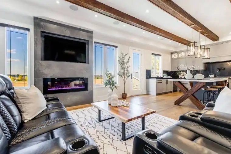 BACKS ONTO PROTECTED LAND. This stunning luxury home is situated on a quiet dead-end st, w/views of the countryside, + steps from park/rink/courts/library. This thoughtfully designed home offers an elegant, vibe, w/high end craftsmanship, featuring a stone + stucco exterior w/exceptional curb appeal. Upon entering, you are greeted by a grand entrance w/ heated porcelain tile floors, a custom wood staircase w/glass railing, + vaulted ceilings that create an inviting ambiance. The main level showcases engineered white oak flooring + exposed beam accents. The spacious living room offers custom-built cabinetry, a tiled feature wall with a built-in electric f/pl, + space for a TV. Adjacent is the elegant dining room, equipped w/ built-in cabinetry, dry bar, quartz counters, backsplash, +under-mount lighting perfect for entertaining. The family room flows directly from the dining room, offering a 2nd tiled wall w/ built-in electric f/pl, lg windows + seamless transition. The gourmet kitchen is classy, featuring an oversized island, quartz countertops, high-end s/s appliances, incl a gas range w/ a custom range hood + walk-in pantry. A private office w/views + a mud/laundry room w/heated tile floors, inside entry to garage w/ epoxy floors + w/up from basement. 25 ft ceilings impress, flowing into 2nd flr w/white oak flooring that continues throughout, leading to the luxurious primary suite. This retreat incl access to private balcony, a walk-through closet w/ built-in organizers, + 6PC ensuite w/ dbl sinks, soaker tub, + large glass shower. Two additional bedrooms each have their own 3PC bathrooms w/ tiled showers + heated floors. The basement offers versatility, featuring expansive rec room + walk-out French doors leading to the patio, providing in-law potential. This bright space offers luxury plank floor, full kitchen, 2 bedrooms, + a 3PC bathroom. Outside, enjoy an add. detached,heated 2-car garage w/ gas + water lines for future pool installation.
