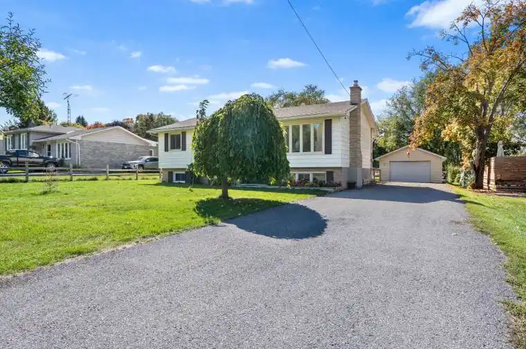 Love the country but want convenience of amenities close by? This bungalow with large garage is just on the southern outskirts of Napanee in a quiet rural setting with forest view across the road, yet only minutes from town amenities. Enjoy the space of a generous 75 x 235 lot, plus the affordability and efficiency of natural gas heating. Inside youll find beautiful hardwood floors in most of the main level with cozy carpet in the living room. The good sized kitchen and a true dining room which features maple flooring . The large master (originally 2 bedrooms now combined) offers an impressive closet area, and there is a comfortable second bedroom as well. The walk out from the kitchen/dining area offers a pantry/closet to a nice deck with gazebo cover and a park sized yard for kids, dogs, or gardens. A smaller fenced area is perfect for dogs, or small children (can be removed). The finished lower level offers more living space including a family room with gas fireplace, 3pc bath with shower, another bedroom, and utility room with handy workshop area. All the big maintenance items have been done for you – central air and furnace (2017). Easy clean windows (15 years) , Shingles 10 years, 200 amp breaker electrical service. Napanee offers everything you need, Just around the bend has a vibrant downtown with unique shops, some great restaurants, schools, churches, parks, library, and the convenient box stores close by . Whether you are starting out, looking to downsize this home offers the perfect blend of country space and town amenities.