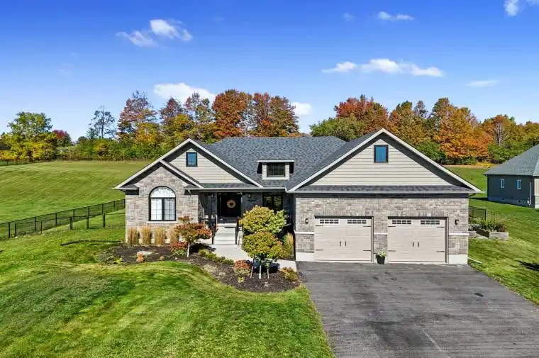 Modern elegance meets effortless entertaining in this stunning home set on 1.28 acres. Designed for entertaining, this home features in-ceiling speakers in the kitchen, living room, and outdoor area, and is wired for sound in the poolside bar, the perfect setting for gatherings both large and small. A covered front porch leads into an open entry where craftsmanship and attention to detail are immediately evident. Throughout the home, 8″ baseboards, high ceilings, and upgraded window and door casements enhance the sense of space and sophistication. The living room impresses with its recessed waffle ceiling, crown moulding, custom built-ins with integrated lighting, and a beautifully detailed fireplace mantel. The open-concept kitchen offers ceiling-height cabinetry, under-cabinet lighting, stainless steel appliances, and large island with breakfast bar. The adjoining dining area features a recessed ceiling, ample room for large gatherings, and a walkout to the backyard. The primary suite offers a tranquil retreat with a tray ceiling, crown moulding, private walkout, walk-in closet, and a luxurious ensuite featuring heated floors, dual vanity with quartz counters, freestanding tub, and glass-enclosed shower. Two additional bright bedrooms and a full bathroom are situated on the opposite side of the home for added privacy. Completing the main level is a powder room, convenient laundry, and access to the double car garage with soaring 13′ ceilings. The lower level expands the living space with a generous rec and media area, built-ins, a games area, guest bedroom, and full bathroom. Step outside to your backyard oasis featuring a fenced yard, sprawling covered deck with added privacy, landscaped patio, inviting inground pool, lounging areas, and a stylish pool house with bar and changing area. Ideally located just moments from amenities with easy access to Hwy 2 and the 401, this property offers modern design, thoughtful details, and resort-inspired living all in one.