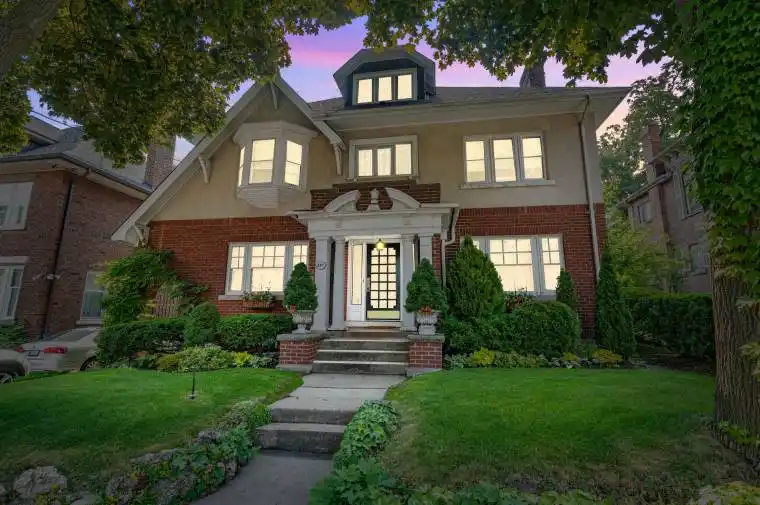 This stately 2.5-stry residence sits on a mature 46′ x 85.33′ lot in Hamilton’s prestigious Durand neighbourhood. Showcasing timeless curb appeal, the front walkway leads to a covered porch framed by Doric columns & an entry door w/ wrought-iron grillwork. Inside, a grand foyer w/ crown moulding, a sweeping staircase & French doors introduces elegant principal rms. The formal liv rm feat a gas FP, an intricate mantle w/ hidden side cabinet, & windows overlooking both gardens. The adjoining din rm impresses w/ built-in cabinetry, leaded stained glass, and rich millwork throughout. The kitchen is a showpiece, featuring heated limestone floors, custom cabinetry w/ beveled glass, marble counters, under-cab lighting, pantry, & premium S/S appliances incl a Viking gas range, Sub-Zero fridge, & Miele d/w. Surrounded by windows, it opens to a covered porch w/ a Phantom screen, perfect for indoor-outdoor living. A handy mudroom w/ dbl mirrored closet completes the main lvl. Heading up the main staircase, a landing of stained glass welcomes you to the 2nd level, feat a 25.9′ x 13′ primary suite w/ sitting area, dual closets, & access to a bright den/sunroom (heated flrs). 2 add’l bdrms – one w/ a bay window & ensuite, the other with garden views – plus a 4-pc bath w/ a jetted tub, stained glass, & hand-painted murals complete this lvl. The 3rd lvl offers a private bdrm retreat w/ a 3-pc ensuite, skylights, gas FP, storage, & cozy sitting nooks. The lower lvl adds laundry w/ custom cabinetry, a 2-pc bath, storage & workshop space. Outside, enjoy a private yard w/ a fountain, covered composite porch, retractable awning, gas BBQ hookup, detached garage + surfaced parking for 2 & security lighting. Add feat incl: hardwood flrs, custom window coverings, c/air, HEPA air purifier, a security sys & more. Walkable to the Locke St cafés, boutiques, art galleries, hospitals, GO Transit, parks & trails – Durand offers historic character & an unmatched lifestyle of quiet sophistication.