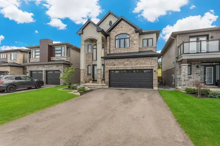 This exceptional residence combines timeless elegance with modern luxury, offering 4 bedrooms, 3 bathrooms and a spacious layout ideal for relaxed family living and stylish entertaining. Step inside the impressive foyer, where oversized Carrara Mare porcelain tiles, detailed wainscoting, and a sparkling three-tier crystal chandelier. Expansive ceilings, 8-foot interior doors, and wide-plank engineered oak flooring elevate the sense of openness and flow. Double French doors reveal a flexible space ideal for a private office, playroom, or formal dining. At the center of the home, the gourmet kitchen is a true showpiece featuring solid wood cabinetry, full-slab Italian porcelain countertops, and an eye-catching backsplash. The oversized 8′ x 5′ island and discreet walk-in pantry seamlessly combine beauty and functionality. The adjoining open-concept living area is bathed in natural light, complete with a sleek electric fireplace and built-in surround sound for an inviting atmosphere. Upstairs, the luxurious primary suite offers a spa-inspired 5-piece ensuite with dual vanities, his-and-hers shower heads, and a Carimali waterfall feature surrounded by stunning Bianco Stone porcelain. Two additional bedrooms with walk-in closets, plus convenient bedroom-level laundry, ensure comfort and practicality. The backyard is designed for effortless entertaining with stylish stonework and complete privacy with no direct neighbours. Perfectly situated just minutes from Niagara’s renowned wineries, scenic walking trails, and picturesque parks, this home delivers the ultimate in refined living.