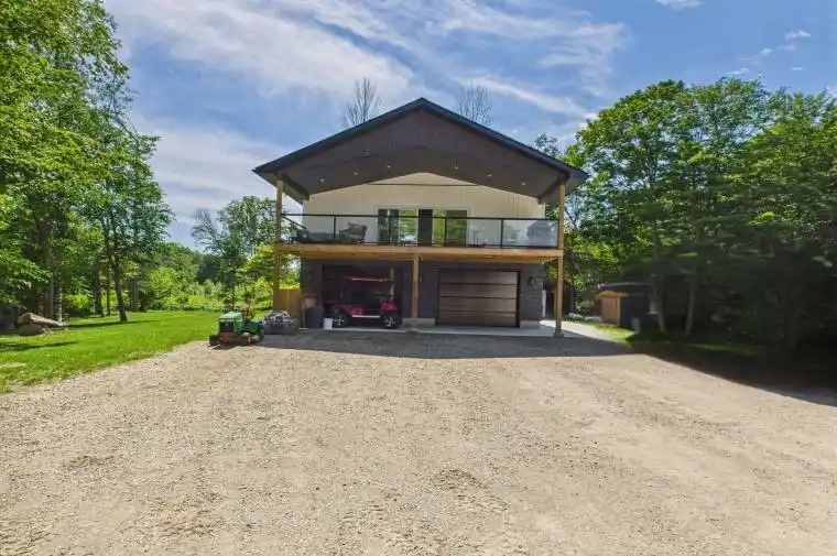 Welcome to 127 Hemlock Street in Point Clark-a stunning modern chalet-style home built in 2021, designed for comfort, style, and convenience. Just 1.1 km from the pristine sandy beaches of Lake Huron, this residence invites you to enjoy a tranquil lakeside lifestyle with the benefits of contemporary living. Enter through the spacious 29′ x 22.5′ double car garage, beautifully finished with Trusscore paneling and offering ample room for vehicles, tools, or recreational gear. Versatile in design, it can easily transform into a lively retreat with space for a pool table, couches, TV, or ping pong. Behind the garage, an attached storage shed with exterior access provides extra space for seasonal items or workshop needs. A long gravel driveway with a concrete apron welcomes guests and ensures plenty of parking. Inside, the open-concept main living area features vaulted ceilings, abundant pot lights, and a sleek electric fireplace that anchors the room in warmth and style. The high-end kitchen showcases stainless steel appliances, a large double sink, and a practical pot filler, all seamlessly flowing into the dining and living areas. Step out to the 305 sq. ft. covered balcony-ideal for outdoor dining or morning coffee. The ground level includes a bedroom and a stylish three-piece bath for flexible living. Upstairs, discover two generous bedrooms, including a primary suite with a walk-in closet and a three-piece ensuite featuring a tiled shower. A four-piece bath with tiled floors and ample cabinetry completes the upper level. Comfort is ensured year-round with radiant in-floor heating and efficient dual-unit ductless splits for cooling. Just 15 minutes to Kincardine and 30 minutes to Bruce Power, this exceptional home blends lakeside living with modern luxury-a truly unique opportunity in Point Clark.