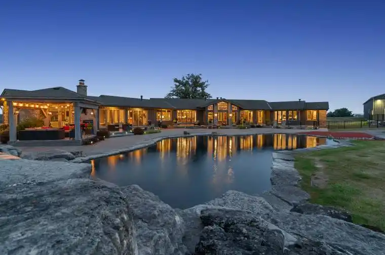 Experience an extraordinary retreat set on over 120 acres of natural beauty. This custom stone bungalow, spanning 10,454.23 sq. ft., showcases high-quality finishes and thoughtful design. Step into the gourmet kitchen, equipped with Viking Professional appliances, Silestone Quartz surfaces, and striking Douglas fir beams. The dual islands invite gatherings, while the dining area offers seating for 14, overlooking a scenic ponds. High ceilings throughout the home create an open, inviting space, while the use of stone and wood details adds a warm, cozy atmosphere. Hand-chipped stone accents and skylights flood the interior with natural light, enhancing the home’s connection to its surroundings. The primary suite opens directly to the swim ponds, offering indoor-outdoor living and a spa-like ensuite with a jacuzzi tub beside a gas fireplace. An indoor grilling area with heated floors offers year-round enjoyment, making it an ideal space for entertaining. The lower level is designed for fun and relaxation, featuring a full bar, billiards area, wine cellar, and a private cinema for movie nights. Outdoors, you’ll find two ponds: one with a sandy beach and waterfall, and the other stocked for fishing. A heated, 4,000 sq. ft. exterior building with in-floor heating adds both function and flexibility to this expansive property. Explore the trails, unwind in the sitting areas, and enjoy this ultimate private getaway!