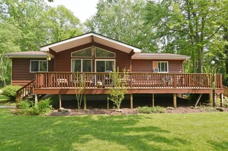 FOUR SEASON – VICEROY HOME. Attached Garage (23×23′). 2 Bedroom/1 Bath Bungalow only a few blocks from Lake Huron. Located at the end of a dead-end street. Private back yard surrounded by trees. House is approx 1100sf. Enter through a large foyer to the family room with vaulted ceilings and wood stove. Bright living room with sliders to the side deck. Kitchen includes solid wood pine cupboards, lots of counter space and a skylight. Dining area with large windows. Nice sized primary bedroom. Cozy 2nd bedroom with shiplap on the ceiling. Bathroom includes tub/shower. Laundry room wit extra storage. Laminate floors throughout. Furniture negotiable. Garage is heated with propane gas. It has concrete floors, 11 foot ceilings, new window and has been freshly painted. Shingles done in 2019. Seller will have the septic tank pumped & inspected to meet Band requirements before closing. Current land lease is $3000/year. Band fees are $2266/year. You need cash to purchase, traditional mortgages are not available on native land. Buyer must have a current police check and proof of home insurance to close. Approx 50 Minutes from London, 30 Minutes from Sarnia and 20 Minutes to Grand Bend. Close to golf, grocery store, restaurants and the beautiful sandy Ipperwash Beach!