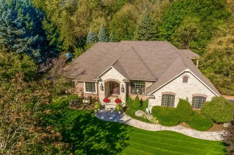 This well maintained executive 4 (3+1) bdrm custom BUNGALOW with approximately 4470sf of beautifully finished living space combines rural serenity with urban conveniences: a perfect blend of country living and luxury. It is situated on a much sought-after cul-de-sac nestled in the quaint village of Carlisle. The manicured half-acre+ lot backs and sides on to beautifully treed conservation lands. The semi-open concept main flr has been freshly painted throughout, & features an integrated living area consisting of a well-appointed and fully updated eat-in kitchen with 2 magnificent islands accommodating seating for 10 with high-end app (Miele oven/speed oven combo & dishwasher + Jen-Air fridge), and a family rm with a stone façade gas fireplace framed by complementary book shelving and cabinetry. The elegant custom cabinetry offers an abundance of storage. This level also includes an inviting living rm and an oversized dining rm accented by a beautiful coffered ceiling. The generously sized primary room retreat has a 5-pc. ensuite w/i closet. There is also a 5-pc.bath, 2 bdrms, a laundry rm and a 2-pc. bath. Enjoy the luxurious heated limestone flooring that runs throughout the main level. The professionally finished basement, accessible also from the oversized double-car garage, is completed to the same high level of craftsmanship, with high ceilings and large windows. A 27’X37’rec rm, a 4th bdrm, a 4-pc. bath, a utility rm and 4 additional rms can serve a variety of purposes. Updated light fixtures installed throughout. The extremely private back yard oasis has been beautifully landscaped to include a firepit, water feature, and multiple conversation areas well suited for large gatherings. A stunning custom outdoor rm with an integrated large Masters type hot tub complements the private park-like setting. A sprinkler system assists in maintaining the grounds and extensive perennial gardens. A professionally installed lighting system adds to the evening ambience.