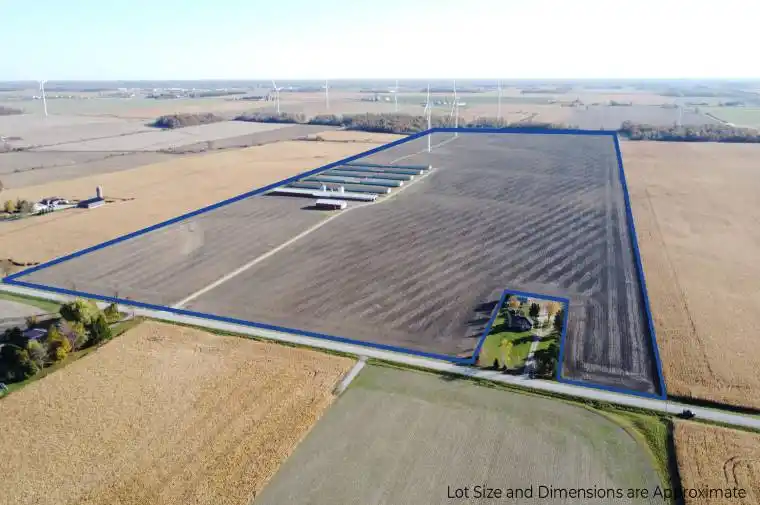 152 acres featuring 138 workable acres of silty clay loam soil. Systematically tiled every 30ft. The property includes a 48′ x 104′ drive shed, 6 identical 40′ x 450′ barns, two storage bins with a combined capacity of ~20,000 bushel, and a pump house including an auto-start diesel generator. Drive shed and barns are serviced by a 1000-amp hydro service and two 90’+ wells. The two wind turbines on the property produced ~$39,650 of income in 2025.
