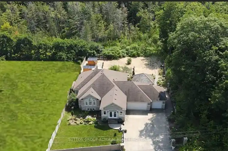 Absolutely Amazing Custom-Built Bungalow Surrounded by Mature Trees. This home offers a generous total living area of 4,700 sq ft, including a 2,350 sq ft main level and a fully livable 2,350 sq ft lower level with 9-foot ceilings and a separate entrance, which can generate additional income to help pay your mortgage, ensuring privacy and convenience for tenants or guests. The lower level features a living room, dining room, and 2 bedrooms with heated flooring and a wood-burning fireplace. Home w/ the Beautiful brick and stone exterior with a triple car garage. Inside features hardwood flooring throughout, pot lights, and a custom kitchen with granite countertops, backsplash, modern-style cabinetry, and a walkout to a large deck with a brick oven and private backyard. Spacious family room with a large window overlooking the front yard. The primary bedroom includes a large walk-in closet. Enjoy the beautiful backyard complete with a natural wood sauna, wood shed, gazebo, and BBQ areaa true outdoor oasis. Just steps to Sawlog Bay, where you can enjoy the fresh air, amazing lake fishing, and relaxing days on the sandy beach.