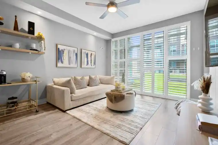 Welcome to AquaBlu Condos in the heart of Grimsby-on-the-Lake! This beautifully upgraded 1 bedroom + den, 1 bathroom main-floor suite offers the convenience of townhouse-style living with your own private entrance and large walk-out terrace featuring views of Lake Ontario.The open-concept layout includes floor-to-ceiling windows with upgraded California shutters, a modern kitchen with stainless steel appliances, granite countertops, and a breakfast bar. The spacious bedroom features a walk-in closet with custom built-in shelves and cabinetry. This carpet-free unit includes one underground parking space located directly beneath the suite for added convenience.Enjoy resort-style amenities including an exercise room, party room, and meeting room. Steps from waterfront trails, restaurants, and shops, and just minutes to highway access and GO Transit. Experience stylish lakeside living at its best in this sought-after community.