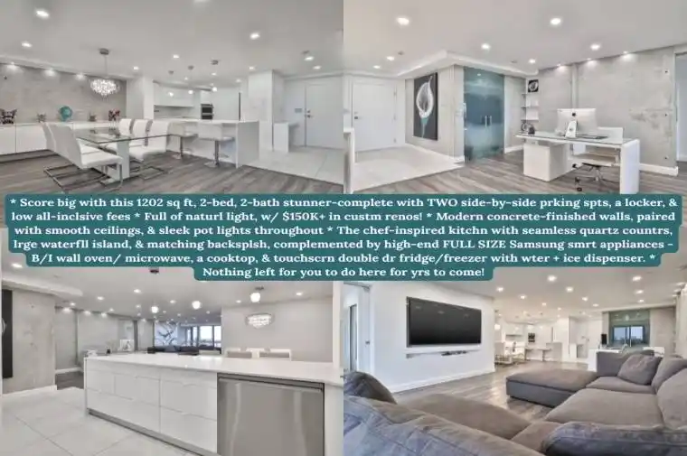 * Why buy a condo with only one parking spot, less spce, no upgrdes & high maintnance fees? * Score big with this 1202 sq ft, 2-bed, 2-bath stunner-complete with TWO side-by-side prking spts, a locker, & low all-inclsive fees (yes, even cable + internt!). * Full of naturl light, this bright, spcious, & super clean suite has been completely reimagined w/ $150K+ in custm renos! * Concrete-finished walls for a true modrn-loft feel, paired with smooth ceilings, & sleek pot lights throughout (smrt controlled from your phone.) * The chef-inspired kitchn truly impresses with seamless quartz countrs, lrge waterfll island, & matching backsplsh, complemented by high-end FULL SIZE Samsung smrt appliances inclding a B/I wall oven/ microwave, a cooktop, & touchscrn double dr fridge/freezer with wter + ice dispenser. * Nothing left for you to do here for yrs to come! * The open-concept layout is perfect for hosting! * Entertaining flows easily frm the lrge island to the spacious dining area. * There’s even a dedicated office nook for work from home ease and an east facing balcny to enjoy your morning coffee with a skyline view. * Both bedrms are generously sized & feature privte ensuites with upgrded fixtures, & the primry retreat includs custom B/I dble closets & a spa-style rain shwer with gorgeous shwer tiles & dble sinks. * Every detail was thoughtfully executed- remote contrlled blinds, smrt lighting, elegant flring, & a layout that feels more like a home than a condo. * Lcated close to the elevator in a well-managed, highly sought-after building known for its exceptional value and community feel. * Nothing to fix, nothing to add-just move in and live beautifully. * Amazing location in the heart of North York surrounded by green spaces, parks & nature trails. TTC/ transit stops just steps away w/ easy accss to Finch Subway, Allen Rd, Hwy 401, plces of worshp, shopping & entertainment. * Don’t miss this one!! *