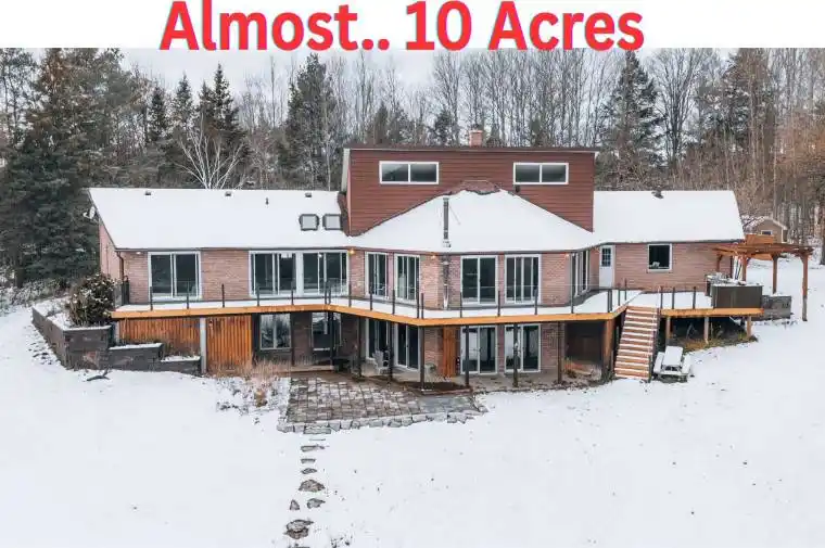 Elevated Elegance on Nearly 10 Acres Backing York Regional Forest Perched atop a scenic hill, this beautifully reimagined bungalow blends modern sophistication with natural serenity. Set on a premium 9.93-acre lot with full southern exposure, it backs directly onto the York Regional Forest North Tract-granting entry to over 800 acres of scenic trails and unspoiled wilderness. This rare connection provides unmatched privacy and year-round adventure, ideal for hiking, horseback riding, mountain biking, and cross-country skiing. Step inside to an airy open-concept design featuring a dramatic 19-foot vaulted ceiling, expansive floor-to-ceiling fireplace, and sweeping views through multiple walkouts to a sprawling Trex wrap-around deck with sleek glass railings. The custom kitchen is a showpiece, complete with quartz surfaces, bespoke cabinetry, a live-edge island, and stainless steel appliances. The primary retreat includes a walk-in closet, luxurious 5-piece ensuite, and private deck access. Downstairs, the finished walk-out lower level is flooded with natural light and offers a versatile layout with a spacious rec room, games area, office, two additional bedrooms, and a dedicated art/media space. Outside, enjoy professionally landscaped grounds, manicured trails, two firepits, a stone patio, and a hot tub-perfect for entertaining or unwinding in nature. Sold in “As is, Where is” basis.