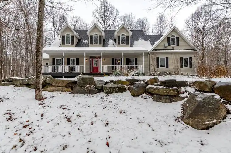 At the end of a quiet cul-de-sac, a meandering driveway leads through the trees to a stately home, accented by a covered front porch & classic dormer windows. Inside the spacious foyer, the formal dining room sits to the right, while the living room opens ahead, featuring a stone-accented wood-burning fireplace & a vaulted ceiling with faux wood beams. The kitchen offers granite counters, a propane cooktop, a built-in raised oven & microwave, & ample cabinetry, perfect for everyday cooking & entertaining. From the living room, two separate hallways extend to the guest bedrooms, creating excellent privacy. One hallway leads to a guest suite with a walk-in closet & 4pc ensuite. The other hallway connects to a second bedroom with an adjacent 3pc bathroom & a nearby den, ideal for quiet work or reading. On the opposite side of the main floor, the large primary suite feels like its own retreat, complete with a walk-in closet, faux-beam-accented vaulted ceilings, & a 5pc ensuite featuring a jetted soaker tub, shower stall, water closet, & double-sink vanity. Upstairs, the family room, with its propane fireplace, offers a comfortable gathering space, complemented by a convenient 2pc powder room. Beyond this, a generous open area is currently arranged as two separate office spaces, perfect for work-from-home flexibility or creative pursuits. Bell Fibre is installed at the property, providing excellent connectivity. Outdoors, the property enjoys private, deeded access to Peninsula Lake, shared with only two neighbouring properties, via a private, cleared hiking trail. The trail leads to a hard-packed sand entry & a private dock, offering a simple, convenient spot to launch a canoe or kayak, or even to dock your boat. The northeast boundary of this property adjoins the protected Pen Lake Farms Nature Reserve, creating a peaceful natural buffer & enhancing the quiet surroundings. This home offers thoughtful design, privacy, & a rare opportunity for private waterfront access.