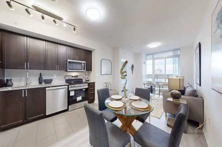 Welcome to the Italian-inspired, master-planned community of Treviso, set within a well-established neighbourhood. Transit is right at your doorstep and you’re just a short walk to Shoppers Drug Mart, children playground, parks, Lawrence West Subway Station, Lawrence Allen Centre, churches, schools, the Columbus Centre, grocery stores, shops, restaurants, cafés, and more. Minutes to Prestigious Yorkdale Mall, with a quick subway ride to downtown and easy access to major highways.This lovely, newly renovated suite features a desirable split 2-bedroom layout with an open-concept design, new laminate flooring, fresh paint, new stainless steel fridge, stove, dishwasher, and updated light fixtures. Kitchen comes with pantry for extra storage. An impressive oversized covered terrace extends your living space outdoors-perfect for relaxation or entertaining. Offering 682 sq. ft. (as per plan), the suite includes two well-proportioned bedrooms and two full bathrooms, making it ideal for first-time buyers, young families, professionals, or investors.Treviso residents enjoy exceptional amenities including an indoor pool, saunas, rooftop hot tub, fitness centre, party room, spacious outdoor lounge with BBQ area, 24-hour concierge, and plentiful underground visitor parking.