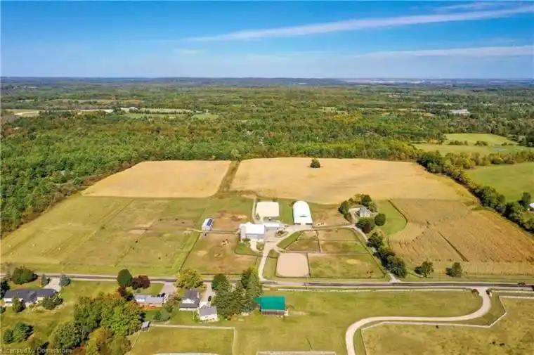 54.99 acres more/less in prestigious Carlisle on natural gas, Bell fibe underground to the house, and walking distance to 2 schools! Here is your opportunity to own a beautiful farm with A2 zoning, has no ‘P’ City of Hamilton zones, and allows for a variety of permitted uses on natural gas! This sparkling, super stylish, 1800’s stone home boasts fresh organic modern decor, sits proud upon a hilltop and offers exceptional vista views, horses frolicking and nature’s offerings always so entertaining. Solar panels are owned on contract to 2033 paying an impressive .80 c/kwh, portion of land leased to tenant farmer, equestrian portion leased. Opportunity here to start your own multi generational family farm … buy and hold … move in and have fun … or lease it out for future investment. Carlisle is home to many amenities and the friendly village itself is quite charming, a must visit is the Carlisle Bakery for a tasty sandwich or pizza slice and coffee to go! Golf courses, hockey arena, baseball diamond, walking trails, always lots of outdoor fun!