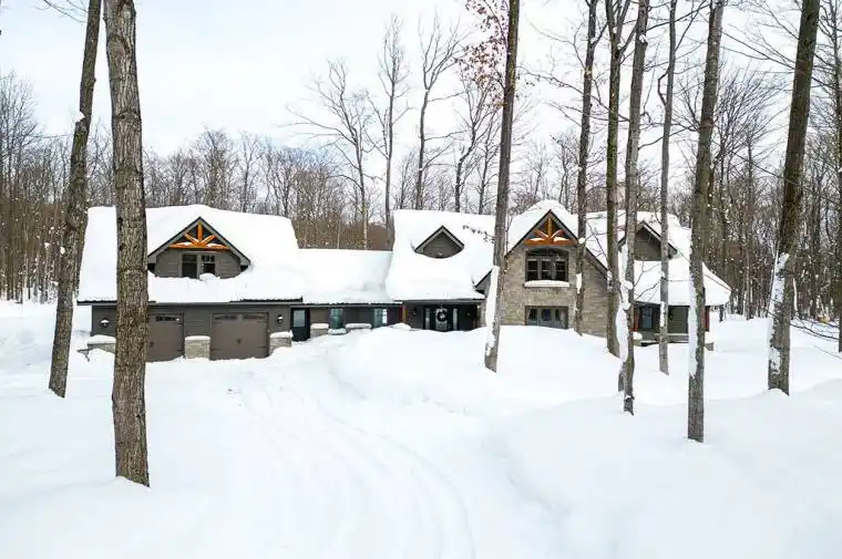 Private sanctuary on 25 acres of serene Meaford countryside, where mature trees and tranquility await. This custom-built retreat offers a blend of luxury and comfort, designed to embrace the beauty of its natural surroundings. A short drive to Downtown Meaford and Georgian Bay. Step inside to discover the heart of the home a great room with vaulted wood-covered ceilings, floor-to-ceiling windows framing views of majestic trees, and a striking stone surround fireplace. The open concept gourmet kitchen features granite counters, a 4ft range, built-in microwave, bar fridge in the island, and a convenient pot filler. Adjacent is the dining space with a walkout to the back deck, perfect for alfresco dining. The main floor also hosts a guest bed, den space, convenient laundry room and mudroom with access to the oversized garage. Throughout the main floor,3/4 inch special walnut plank flooring adds warmth and elegance. All bathrooms are beautifully appointed with granite counters and heated flooring beneath polished ceramic tiles. Upstairs, the upper level offers additional living space with a primary suite, guest bed, 3pc bath, and a versatile bonus room. The spacious primary suite features a covered balcony overlooking the lush grounds, WIC, and a luxurious 3pc ensuite complete with heated floors, heated towel rack and a freestanding tub. Additional features include a durable steel roof, a 10kw backup generator, and 1000sqft drive shed with 200 amp service offers plenty of storage for seasonal toys or use as a workshop! Above the garage, a loft area offers storage or potential studio. The lower level has potential for a huge rec space. Outside, the expansive and private exterior invites exploration and quiet contemplation, making this property an ideal weekend getaway or full-time residence. Just 8 mins from dtown Meaford’s restaurants, shops, and Georgian Bay. Thornbury is a short 18-minute drive away.