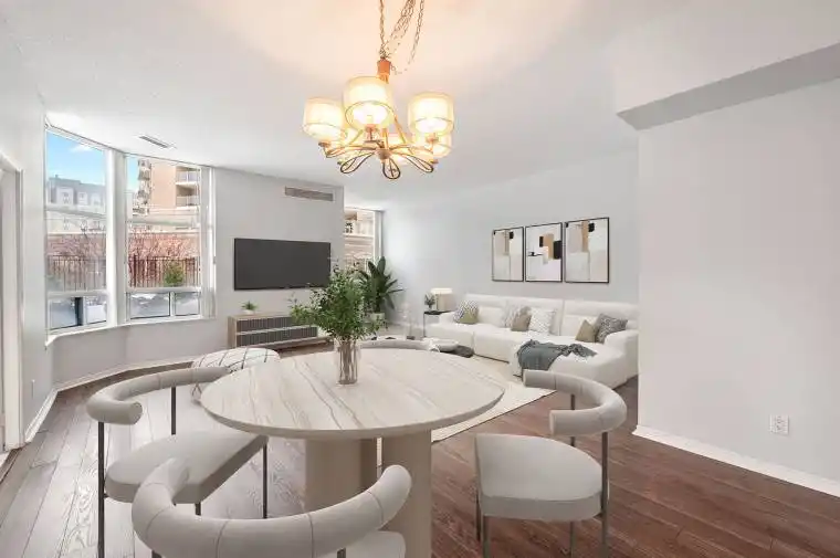 Welcome to 5 Emerald Lane #102. This bright and spacious 1 bedroom, 1 bath condo offers 860 sq.ft of functional living space with 10 foot ceilings. This ground floor suite provides a home like feel with a large private terrace, unobstructed North Eastern exposure and peaceful garden, outdoor pool, and library views. There are walk outs from both the kitchen and the bedroom, creating an easy indoor outdoor flow. The layout offers generous room sizes and excellent natural light throughout the day. Located in a well managed building with great amenities and close to transit, parks, shops, and everyday conveniences.