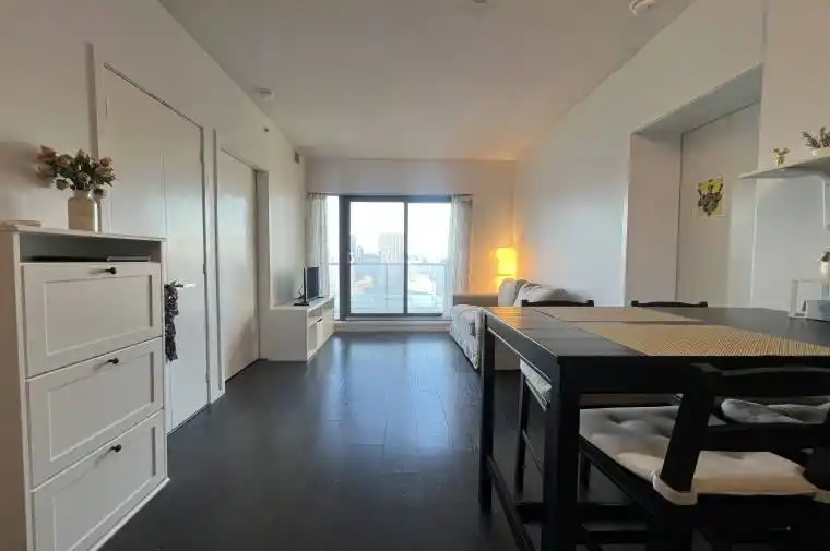 Modern and stylish suite at 159 Dundas St E featuring bright floor-to-ceiling windows, an open-concept layout, and stunning city views. Steps to transit, shopping, and all downtown amenities-perfect for urban living.Furnished Unit!