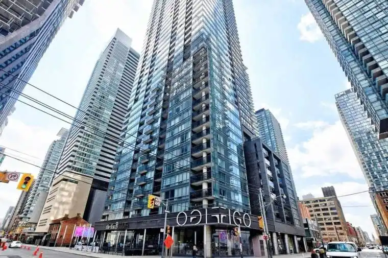 Welcome To The Pinnacle On Adelaide Condominiums. This 2 Bedroom Corner Suite Features Approximately 736 Interior Square Feet. Designer Kitchen Cabinetry With Stainless Steel Appliances, Stone Countertops & An Undermount Sink. Bright Floor-To-Ceiling Wrap Around Windows With Hardwood Flooring & Customized Roller Shades Throughout With A Private 65 Square Foot Balcony Facing CN Tower Views. Main Bedroom With A 4-Piece Ensuite, Mirrored Closet & Large Windows. A Spacious Sized Split 2nd Bedroom With A Mirrored Closet & Large Windows. Steps To The Underground P.A.T.H., The Financial & Theatre Districts Including The City’s Finest Cafes, Restaurants & Entertainment Lounges On King Street West. 1-Locker Space Conveniently Located On The Same Floor. Parking NOT Included. Building Has Visitors Parking.