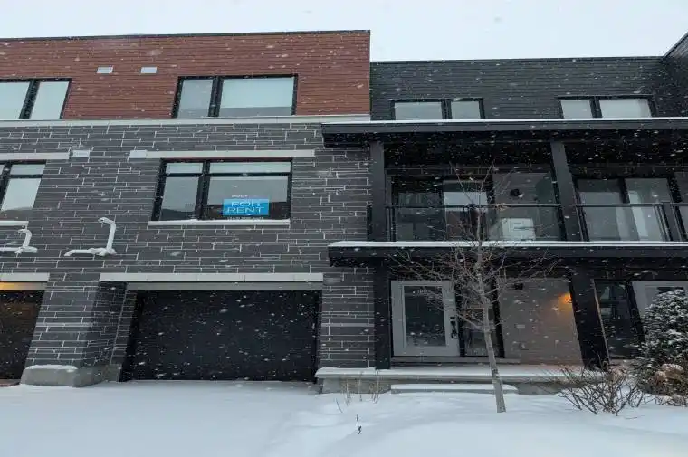 Welcome to this modern executive rental, located in the desirable Katimavik community. Built in 2022, this contemporary 3-storey townhome offers 2 bedrooms and 4 bathrooms (2 full, 2 partial), combining modern design, quality finishes, and a convenient location close to amenities. The main living level features a bright, open-concept layout with large windows and light hardwood flooring throughout the living and dining areas. The kitchen is the focal point of the space and includes a large island with white-veined stone countertops and bar seating, sleek light-toned cabinetry, subway tile backsplash, and stainless steel appliances (refrigerator, stove, oven, microwave, and dishwasher). A sliding glass door provides access to a private balcony/terrace. The upper level offers two well-proportioned bedrooms, including a spacious primary bedroom with a walk-in closet and private ensuite bathroom. Additional bathrooms on each level provide convenience for residents and guests. The ground level features a bright entry foyer with marble-look tile flooring and a closet for outerwear and storage. In-unit stacked laundry is conveniently located on the main level.. Upscale finishes include modern lighting, recessed pot lights, contemporary white trim, and doors throughout. Situated close to shopping, dining, parks, and transit, the property is within easy reach of Hazeldean Mall, Farm Boy, the new T&T Supermarket, walking paths, and local transit routes. Tenant responsible for all utilities (hydro, gas, water/sewer).A well-maintained, modern rental ideal for professionals or a small family seeking low-maintenance living in Kanata.
