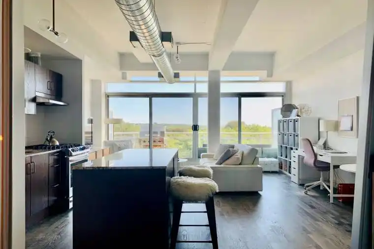 Stunning Leslieville penthouse loft with unobstructed east-facing views over treetops to the lake. This rarely offered 650+ sq. ft. one-bedroom unit features soaring 10-foot ceilings, exposed ductwork, open-concept layout with space for entertaining and work from home. Abundant natural light, an end-to-end balcony, and a generously sized bedroom with closet organizers and additional wardrobe. Includes parking and a bike rack.